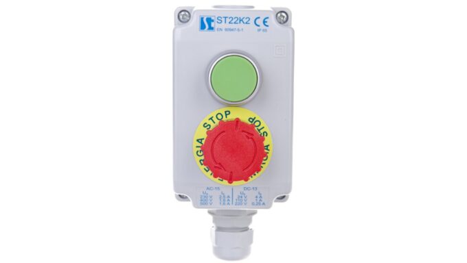 Kaseta sterownicza 2-otworowa zielony/przycisk bezpieczeństwa przez obrót 1Z 1R szara IP65 1x dławnica szara M20 ST22K24-1